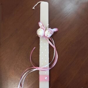 Λαμπάδα πλακέ αρωματική, 30εκ, στολισμένη με πουά τούλι, λουλούδια και κορδέλες.