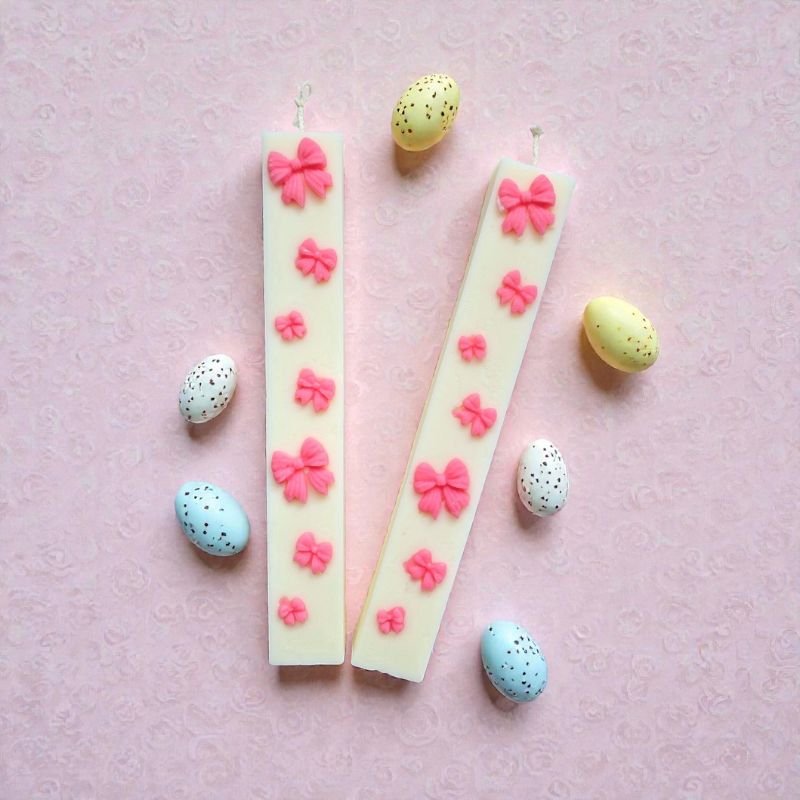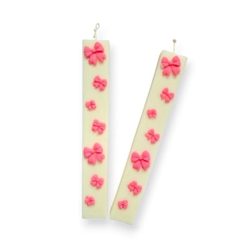 Λαμπάδα με ροζ φιόγκους με 100% Φυτικό κερί ελαιοκράμβης με βαμβακερό φυτίλι, σε χρώμα άσπρο και άρωμα Spring Blossom.