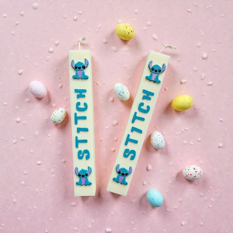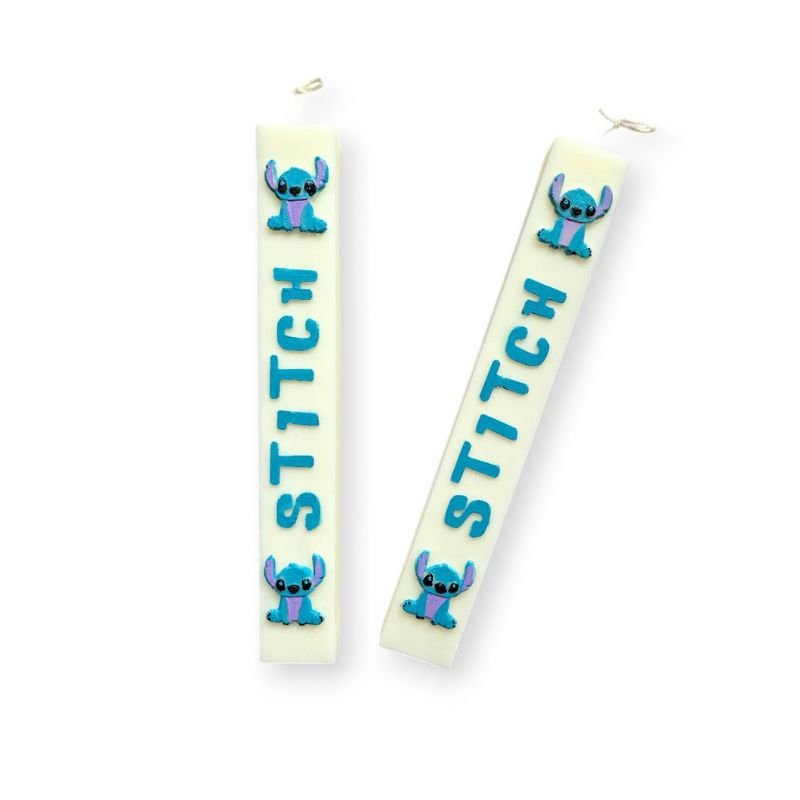 Λαμπάδα Stitch με 100% Φυτικό κερί ελαιοκράμβης με βαμβακερό φυτίλι, σε χρώμα άσπρο και άρωμα Spring Blossom, ζωγραφισμένη στο χέρι.