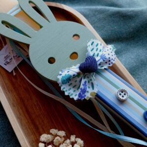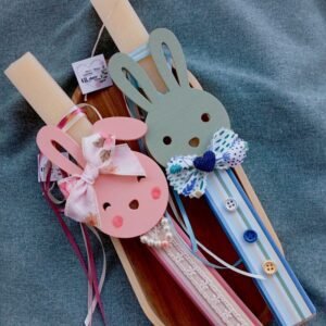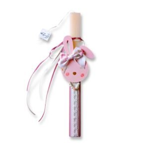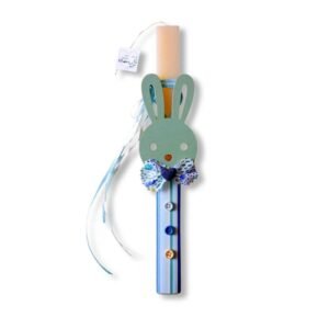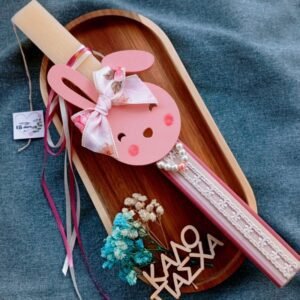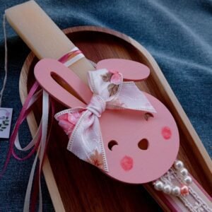 Λαμπάδα με χειροποίητο ξύλινο διακοσμητικό κουνελάκι σε πλακέ, ξυστό, αρωματικό εκρού κερί.