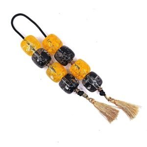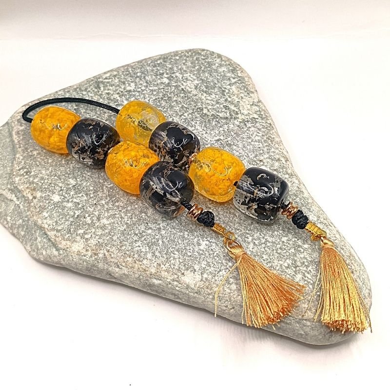 Λαμπάδα με μεγάλο μπεγλέρι-οκτώ χάντρες. Ακρυλικές χάντρες βαρελάκι σε κίτρινο/μαύρο χρώμα με νερά σε κορδόνι συνθετικό μαύρο. Ιδανικό δωράκι για εφήβους.