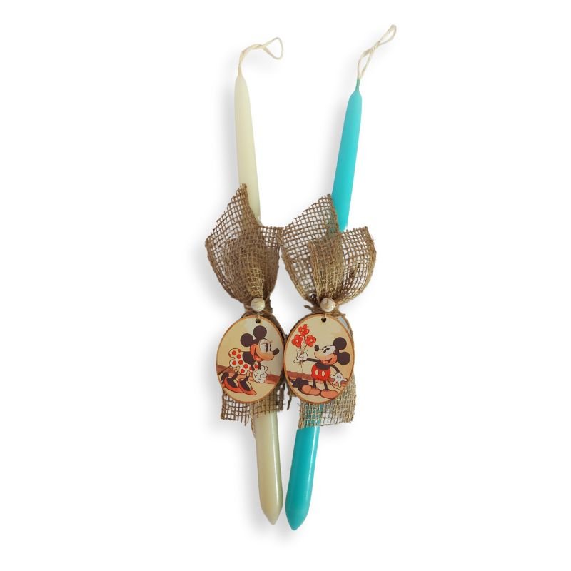 Σετ για ζευγάρια με 2 πασχαλινές λαμπάδες, σε χρώματα εκρού και ciel, με ξύλινα στοιχεία mickey και minnie, συνδυάζονται με λινάτσα καφέ και χάντρες σε ουδέτερα χρώματα.