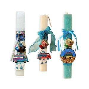 Οι άσπρες λαμπάδες είναι με μπρελόκ τύμπανο και ξύλινο βανάκι ζωγραφισμένο στο χέρι.