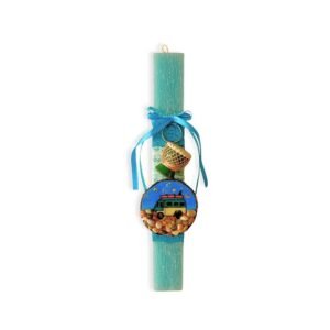 Η πράσινη λαμπάδα είναι με ξύλινο μπρελόκ τύμπανο και με χειροποίητο μαγνητάκι ζωγραφισμένο όλο στο χέρι και στοιχεία από την θάλασσα με πετρούλες και κοχύλια.