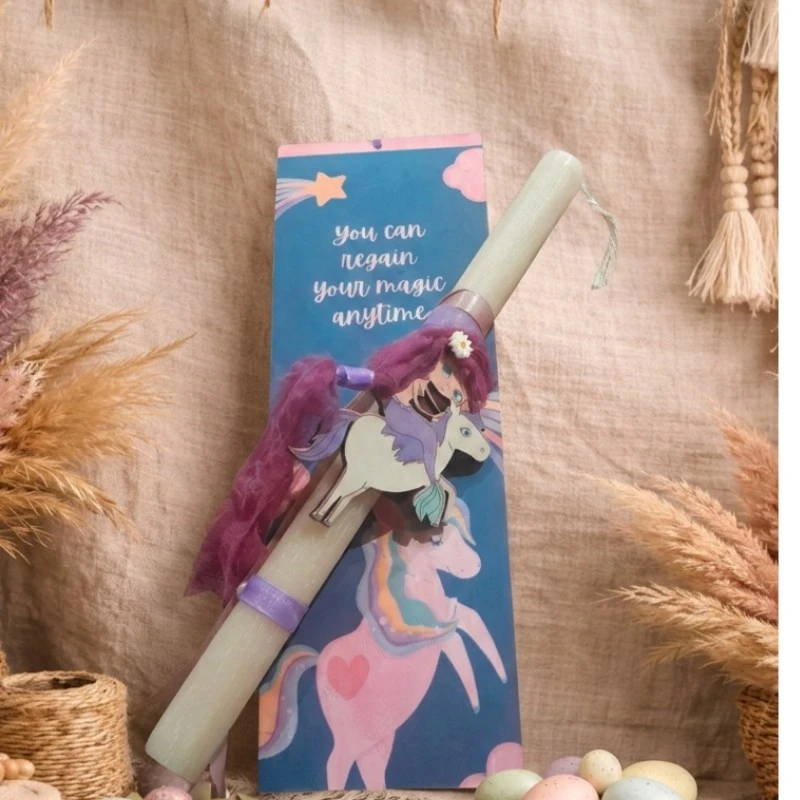 Χειροποίητη λαμπάδα με μονόκερο σε μωβ αποχρώσεις.