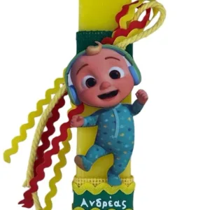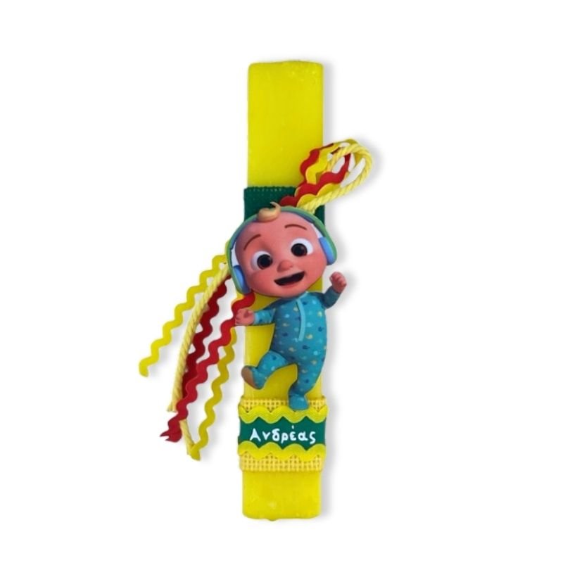 Κίτρινη ξυστή αρωματική λαμπάδα 23 εκατοστά με εντυπωσιακό ξύλινο στοιχείο Cocomelon. Η λαμπάδα έχει υπέροχο άρωμα.