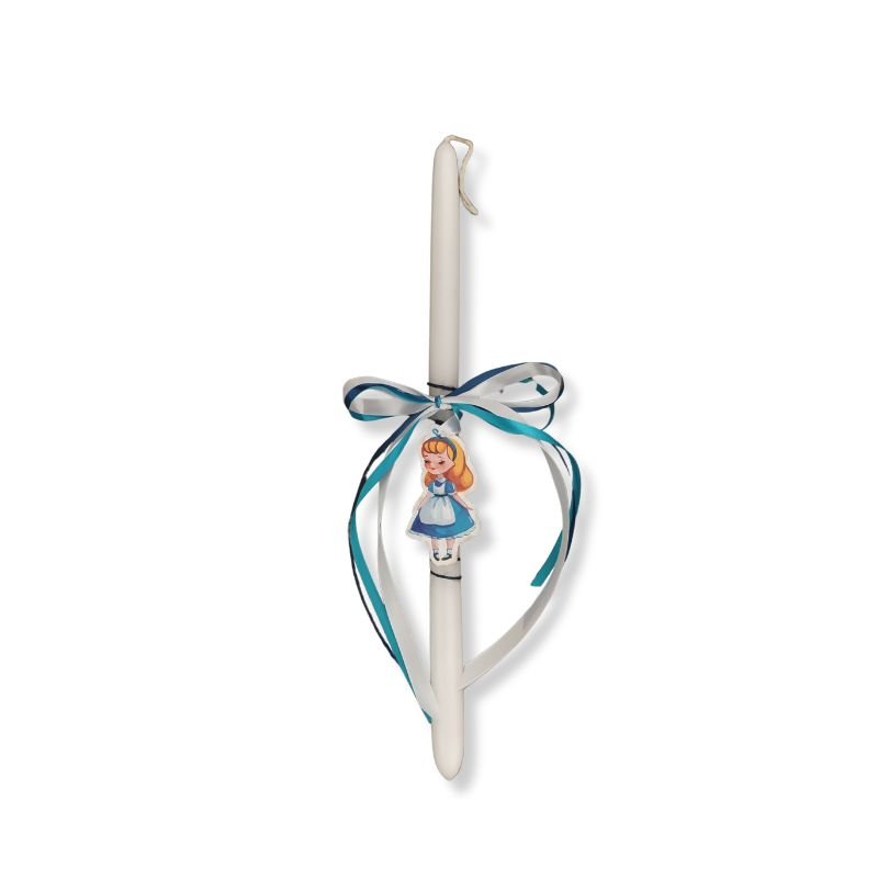 Άσπρη λαμπάδα με ξύλινο διακοσμητικό κοριτσάκι και διακοσμητικές κορδέλες.