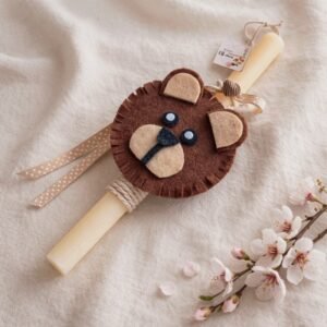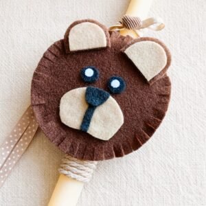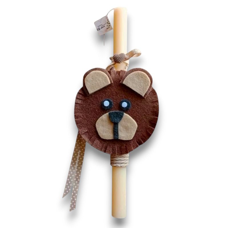 Λαμπάδα με χειροποίητο διακοσμητικό αρκουδάκι από ξύλο (πίσω όψη) και τσόχα, σε στρογγυλό, ξυστό, αρωματικό εκρού κερί 30εκ.