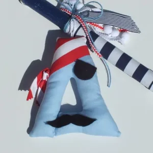 Πασχαλινή χειροποίητη λαμπάδα για αγόρια διακοσμημένη με υφασμάτινο μονόγραμμα – πειρατής. Μπορείτε να επιλέξετε όποιο γράμμα θέλετε.