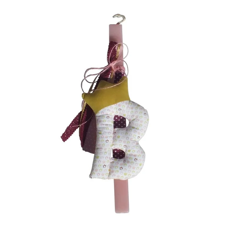 Πασχαλινή χειροποίητη λαμπάδα για κορίτσια διακοσμημένη με υφασμάτινο μονόγραμμα – πριγκίπισσα.