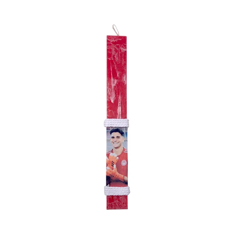 Χειροποίητη αρωματική λαμπάδα 30εκ. με υφασμάτινη εκτύπωση του αγαπημένου ποδοσφαιριστή Τζολάκη του Ολυμπιακού.