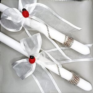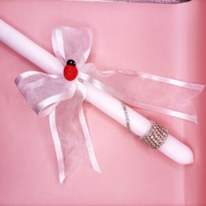 Λαμπάδα elegant με λευκό φιόγκο οργάντζας, πασχαλίτσα και σειρές με στασάκια που λαμπυρίζουν.