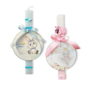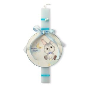 Λαμπάδα, 32 εκ., στολισμένη με κορδέλες και διακοσμητικά στοιχεία. Έχει στολιστεί με στρογγυλό διακοσμητικό τοίχου με λαγουδάκι, “Το Πρώτο μου Πάσχα”.