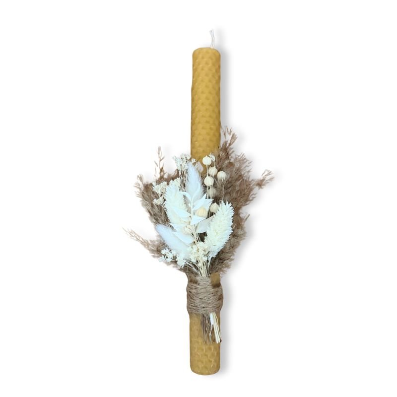 Λαμπάδα μελισσοκέρι 25 εκατοστά σε φυσικό χρώμα με λευκά λουλούδια. Η λαμπάδα έχει υπέροχο φυσικό άρωμα.
