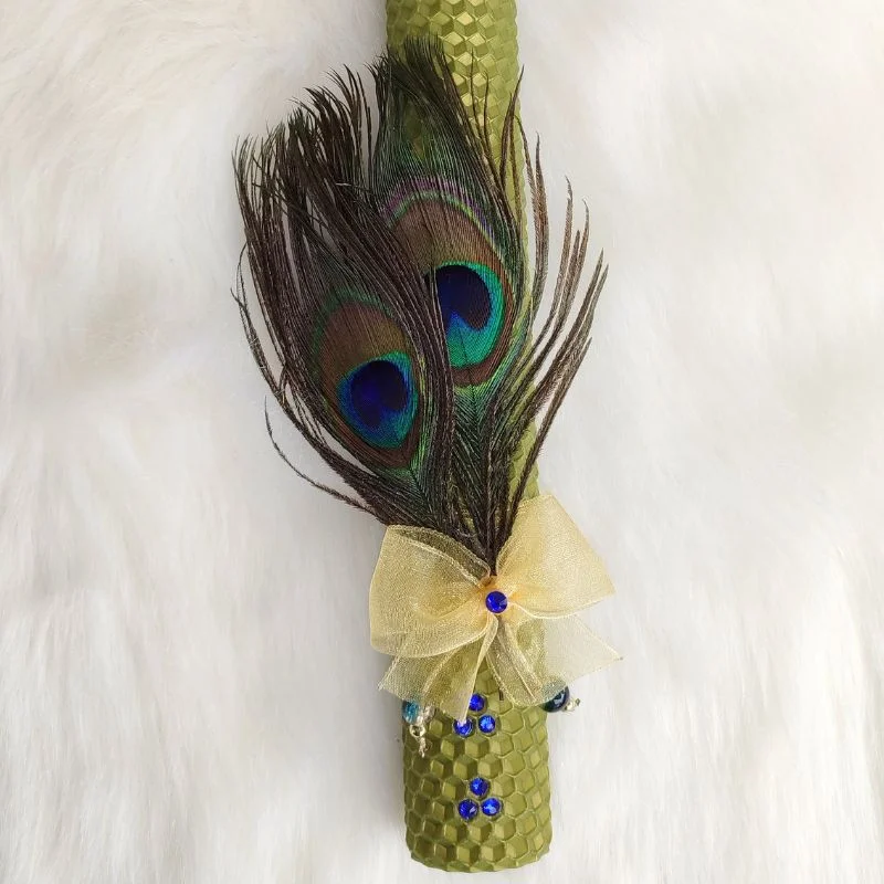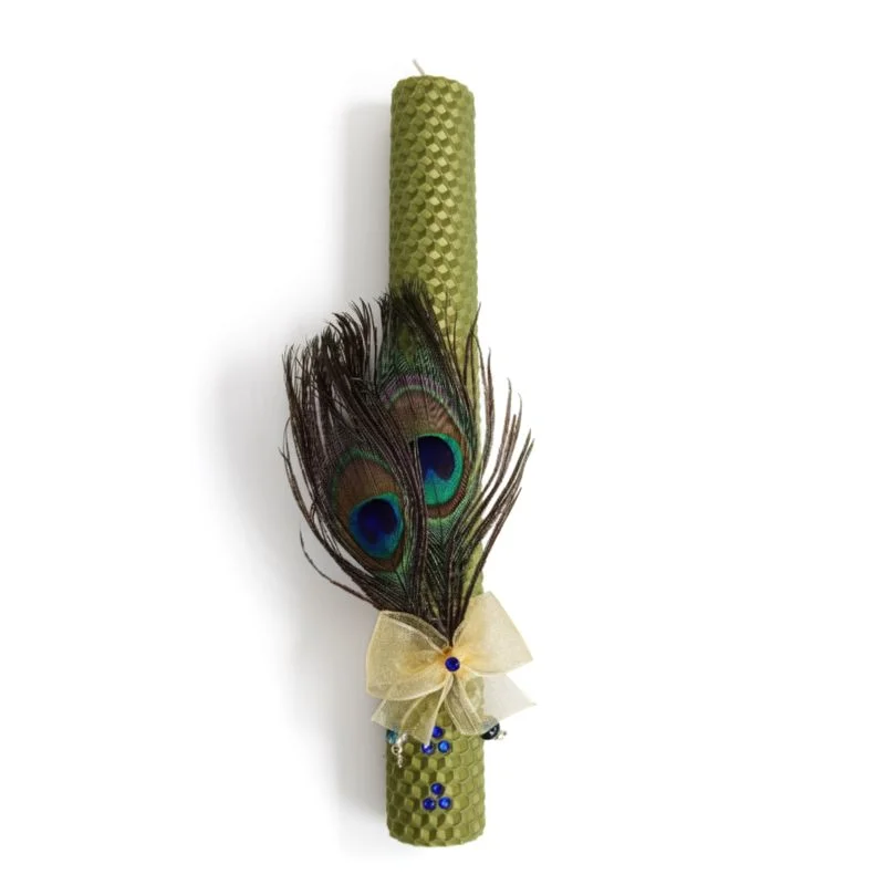 Λαμπάδα μελισσοκέρι σε μεταλλικό πράσινο με φτερά παγονιού