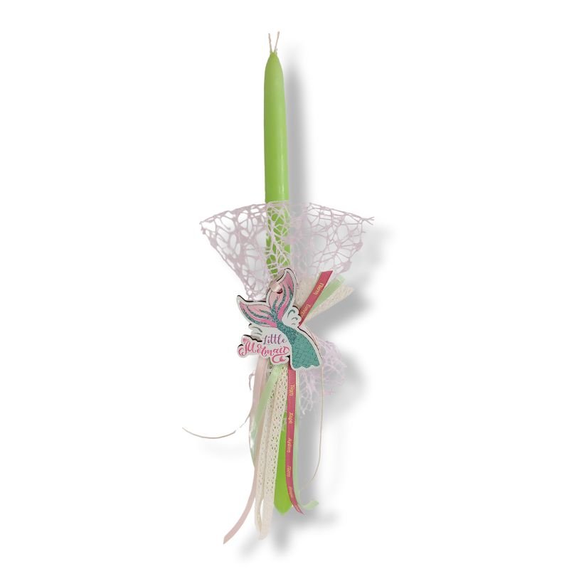 Πασχαλινή λαμπάδα λαχανί, 35 εκατοστών, με ξύλινο στοιχείο ουρά γοργόνας και λογότυπο “little mermaid”. Επιπλέον διακοσμείτε από ροζ δίχτυ και πολύχρωμες pastel κορδέλες , λεπτή δαντέλα και κορδέλα ευχών.
