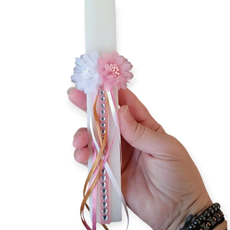 Λαμπάδα εφηβική/ενηλίκων με ανθάκια, κορδέλες και στρασάκια.