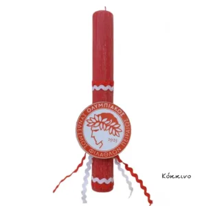 Λαμπάδα, 25 εκ, στολισμένη με κορδέλες στα χρώματα της αγαπημένης σου ομάδας και ξύλινο διακοσμητικό της ομάδας σου. Θα τη λάβετε σε συσκευασία δώρου ασορτί στολισμένη.