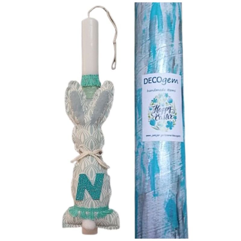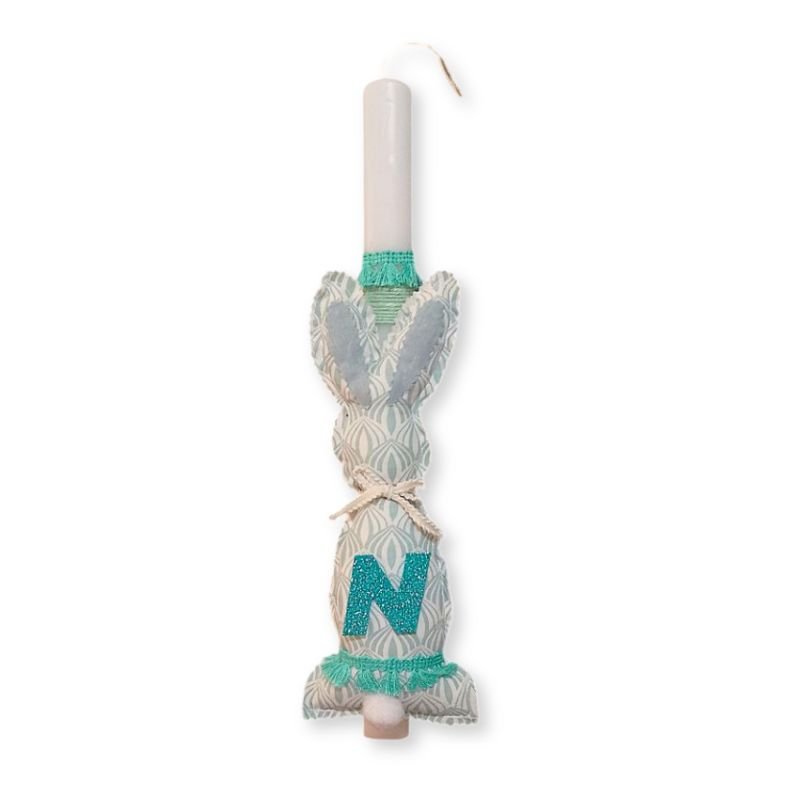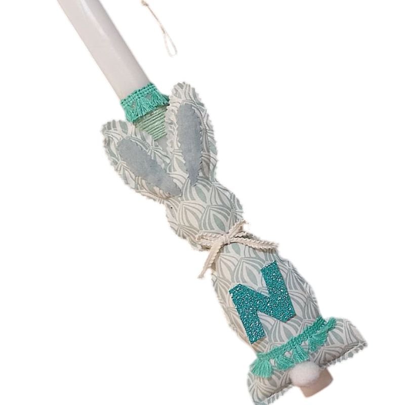 Λαμπάδα με λαγουδάκι ( 25 χ 11 εκ. ) από βαμβακερό ύφασμα βεραμάν-λευκό με το μονόγραμμα του παιδιού.