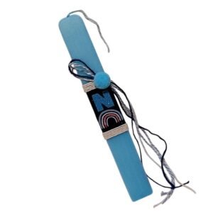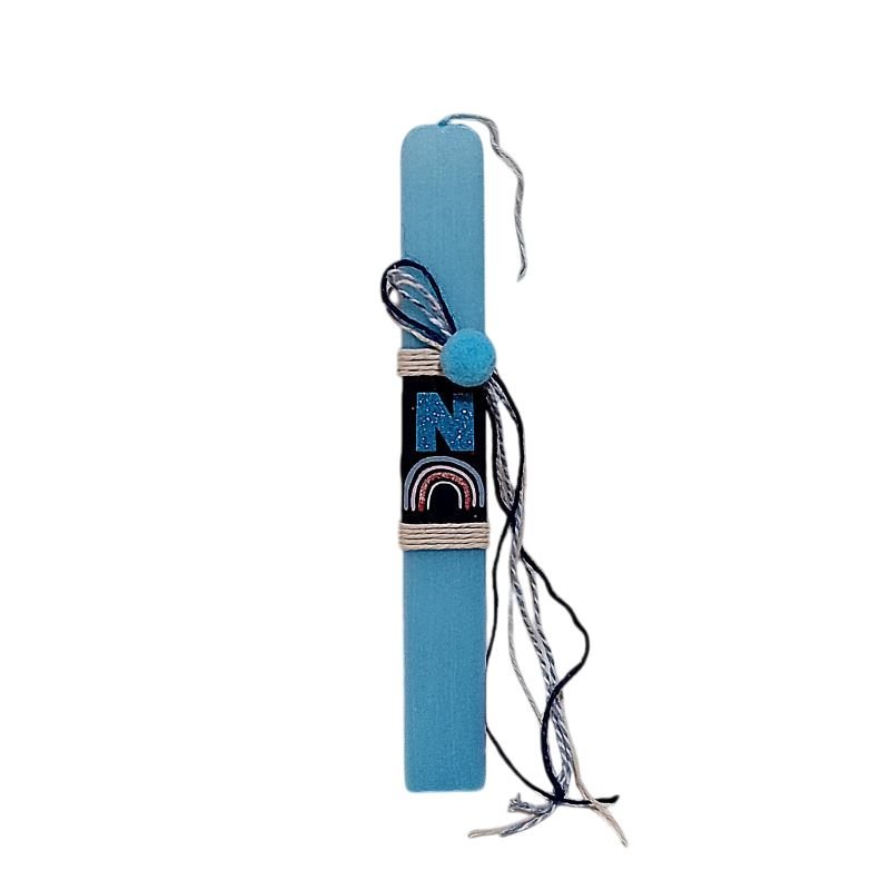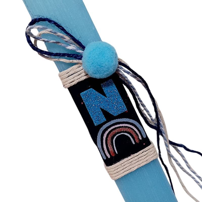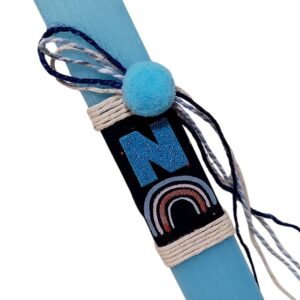 Προσωποποιημένη λαμπάδα¨ Ουράνιο Τόξο ¨ με το μονόγραμμα του παιδιού. Το κερί είναι πλακέ σε γαλάζιο χρώμα 25 χ 3 εκ..