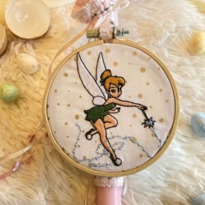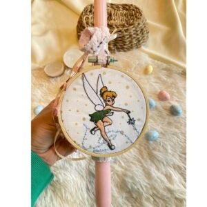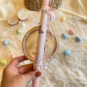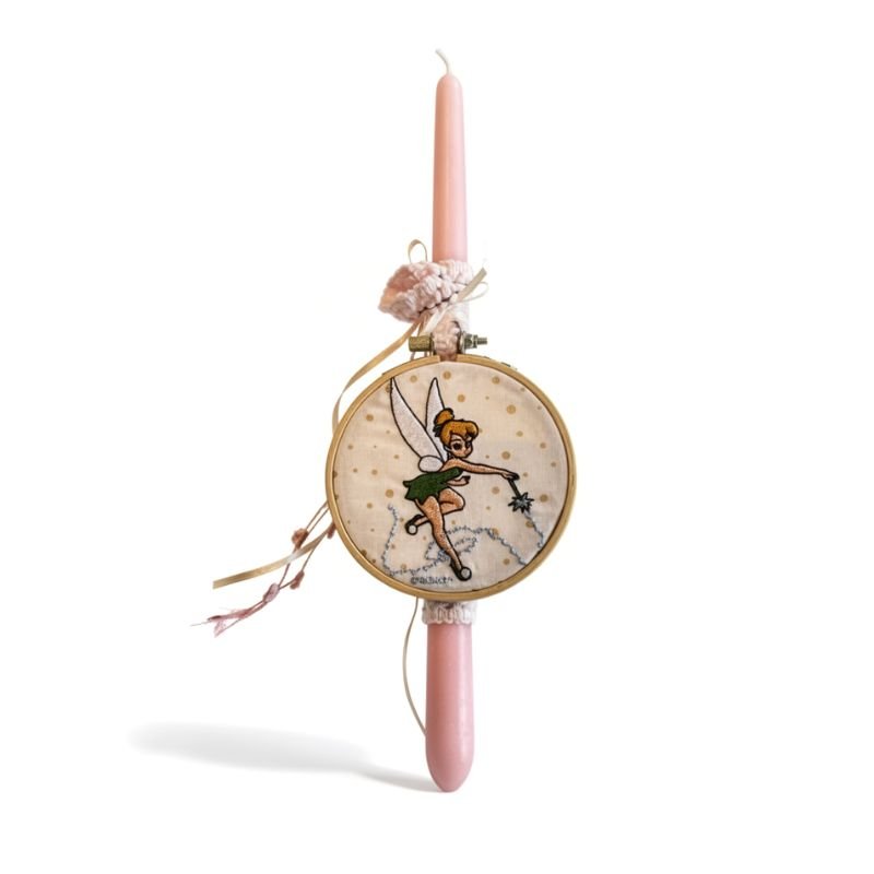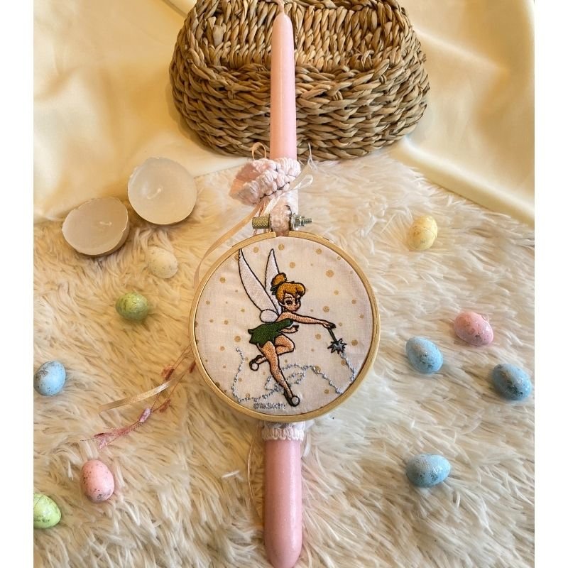 Το κερί στολίζεται περιμετρικά από εμπριμέ ύφασμα με πεταλούδες και λουλούδια, κορδέλες και ένα διακοσμητικό τελαράκι 10 εκατοστών με κεντημένη νεράιδα.
