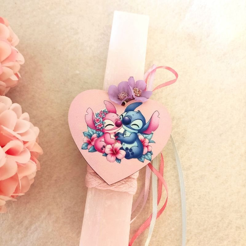 Λαμπάδα πλακέ, ύψους 20εκ, στολισμένη με ξύλινη καρδιά και φιγούρες δύο αγαπημένων χαρακτήρων – ένας μπλε και ένας ροζ – που δημιουργούν μια παιχνιδιάρικη και χαρούμενη πασχαλινή σύνθεση. Τα ζωντανά χρώματα και η ευφάνταστη διακόσμηση τραβούν τα βλέμματα και κάνουν τη λαμπάδα ιδανική για μικρούς φίλους των κινουμένων σχεδίων.