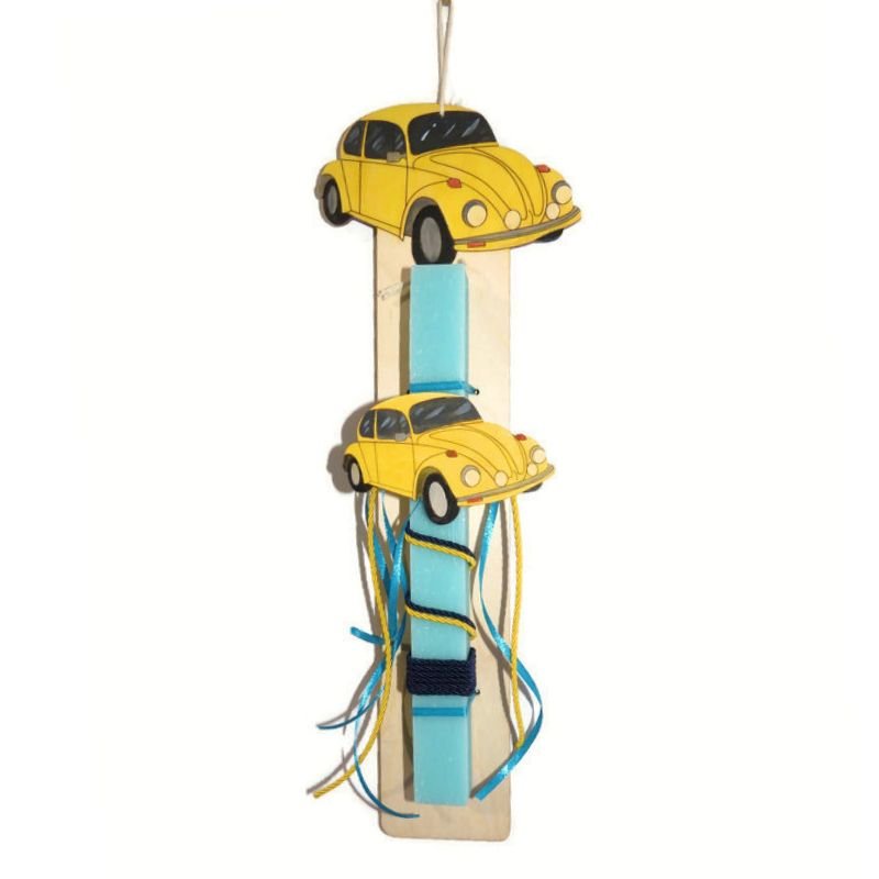 Λαμπάδα σε ξύλινη βάση με Αυτοκίνητο, γαλάζια (26cm)