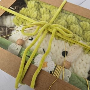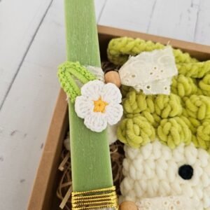 Ιδιαίτερο σετ λαμπάδας με παιδικό τσαντάκι για τις μικρές δεσποινίδες! Αποτελείται από πλεκτό τσαντάκι προβατάκι σε λάιμ/εκρού χρώμα, πλεγμένο με απαλό βελουτέ νηματάκι και αρωματική λαμπάδα 28 εκ. στολισμένη με πλεκτό κλιπ λουλουδάκι!