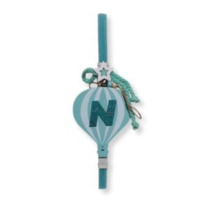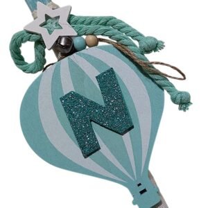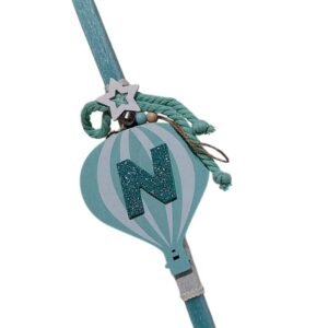 Προσωποποιημένη λαμπάδα με κρεμαστό ξύλινο αερόστατο σε βεραμάν-λευκό ( 16χ10 εκ.) με το μονόγραμμα του μικρού σας, που μετά μπορεί να στολίσει το παιδικό δωμάτιο. Το κερί είναι τετράγωνο βεραμάν με ύψος 30 εκατοστά.