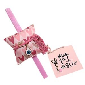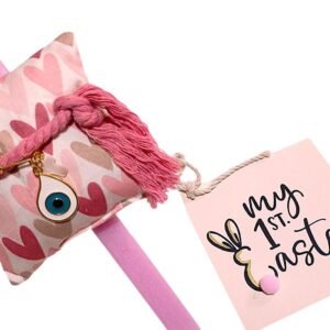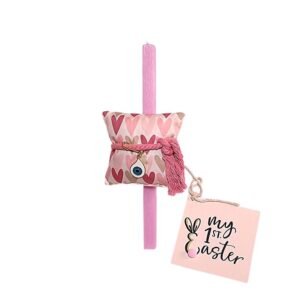 Λαμπάδα τετράγωνη ροζ 25 εκ. με καρτούλα ” My 1st Easter ” και χειροποίητο μαξιλαράκι-φυλακτό από 100% βαμβακερό ύφασμα ελεγμένο και πιστοποιημένο για βλαβερές ουσίες Oeko-Tex σε λευκό με καρδούλες σε ροζ αποχρώσεις. Το μαξιλαράκι στολίζει βαμβακερό κορδόνι ροζ, μεταλλική παραμάνα σε χρυσό χρώμα με σταυρουδάκι φίλντισι και ματάκι μεταλλικό με σμάλτο. Διάσταση 10 χ 10 εκ.