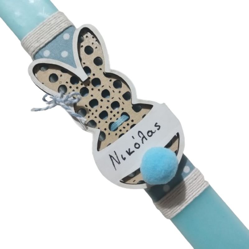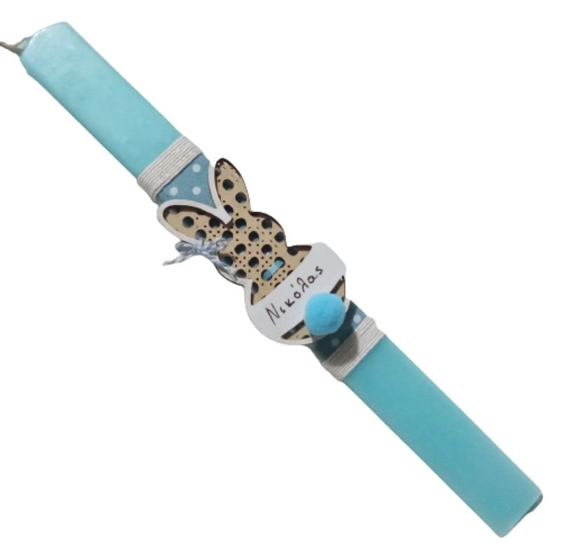 Λαμπάδα με λαγουδάκι από ξύλο ( 10χ 5 εκ.) με γαλάζιο pom-pom και το όνομα του παιδιού. Το κερί είναι τετράγωνο σε βεραμάν χρώμα, με ύψος 25 εκατοστά.