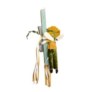Αρωματική λαμπάδα σε βεραμάν απόχρωση, ύψους 30 cm, διακοσμημένη με ένα νεραϊδάκι ύψους 25 cm από βαμβακερό κάμποτο. Τα ρούχα του αφαιρούνται και πλένονται, τα χαρακτηριστικά είναι ζωγραφισμένα με ανεξίτηλα χρώματα, ενώ τα μαλλιά του είναι φτιαγμένα από απαλό βελουτέ νήμα. Ένα ιδιαίτερο πασχαλινό δώρο που θα παραλάβετε σε όμορφη συσκευασία δώρου!