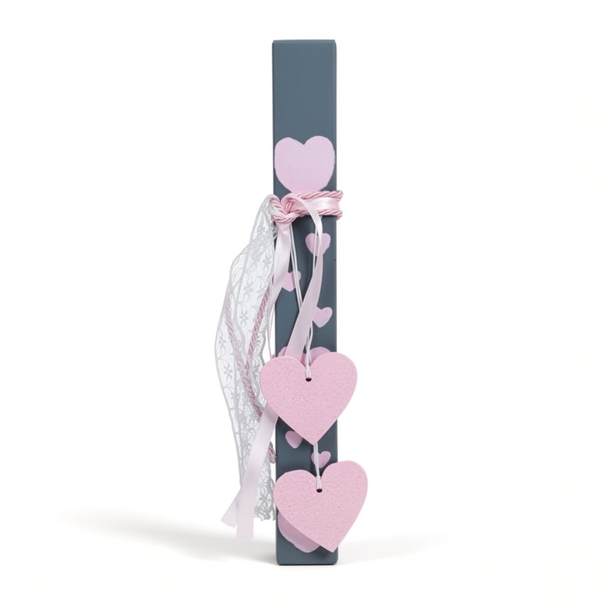 Αρωματική ρομαντική λαμπάδα (34εκ.) με ζωγραφισμένες καρδιές και κρεμαστές ξύλινες καρδιές σε ροζ χρώμα και ρομαντικές κορδέλες.