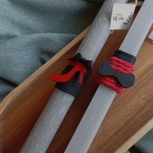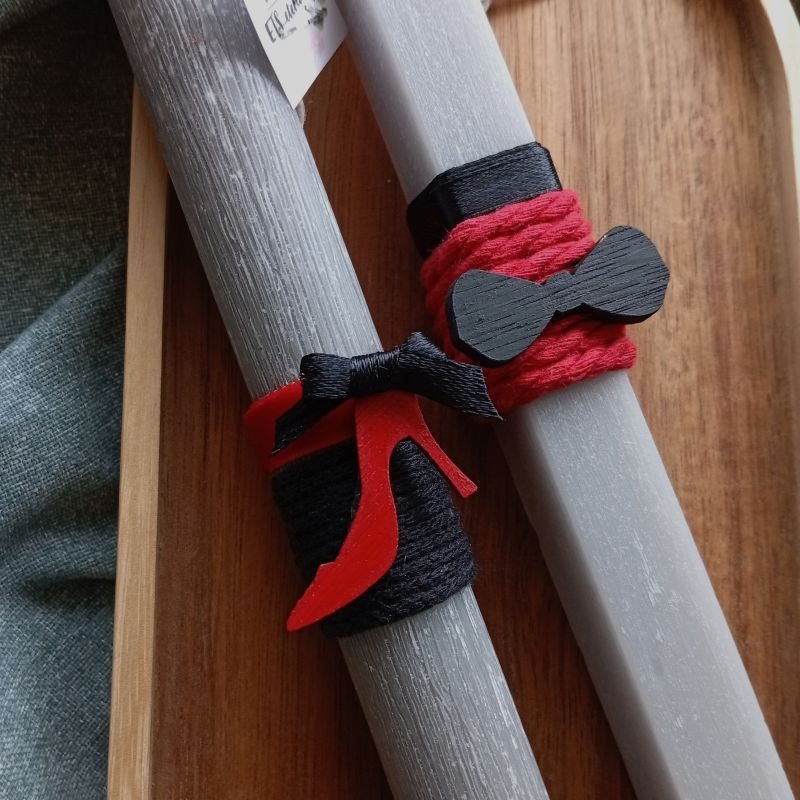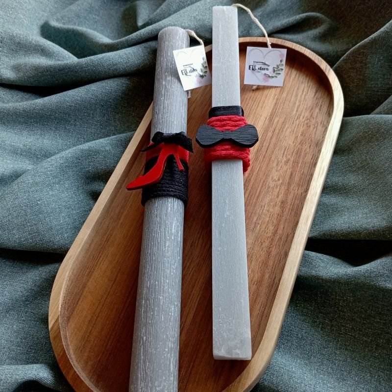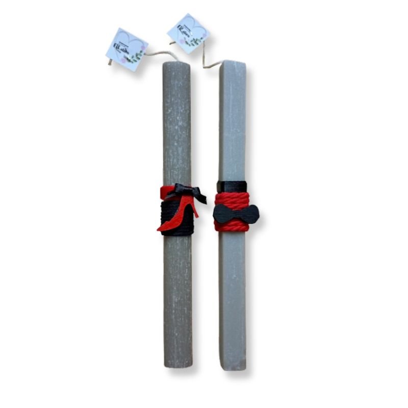 Λαμπάδες για ζευγάρι με στοιχείο παπιγιόν και γόβα, σε τετράγωνο και στρογγυλό (αντίστοιχα), ξυστό, αρωματικό γκρι ανοιχτό κερί 22εκ.
