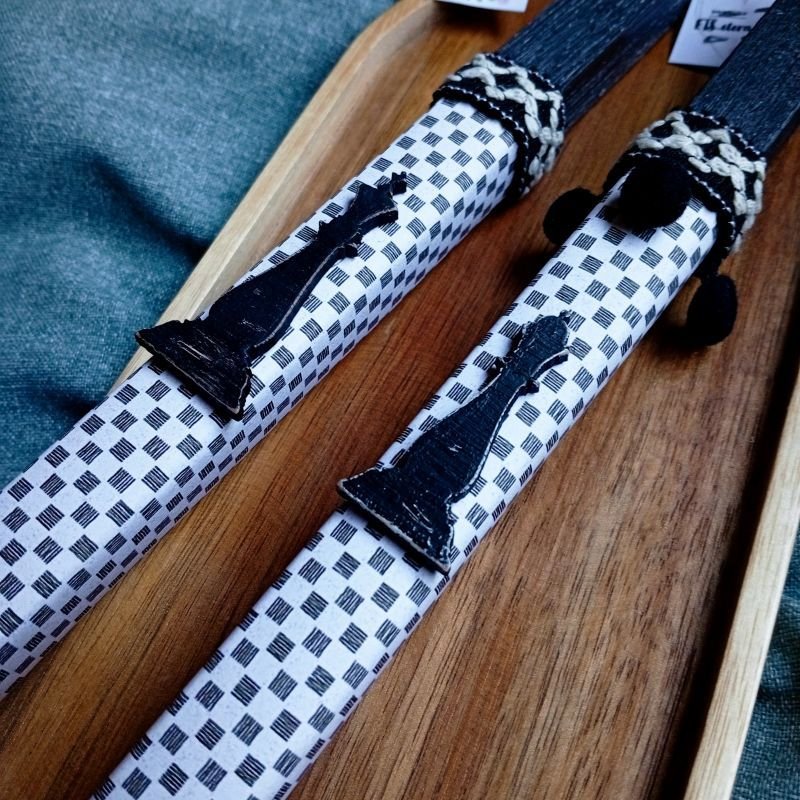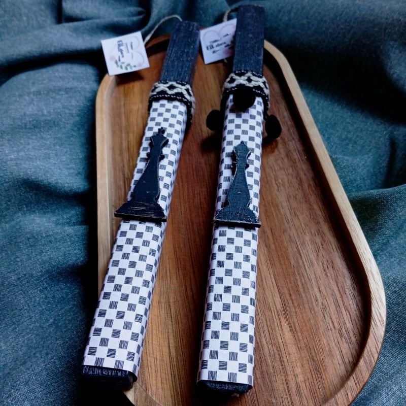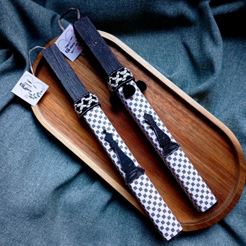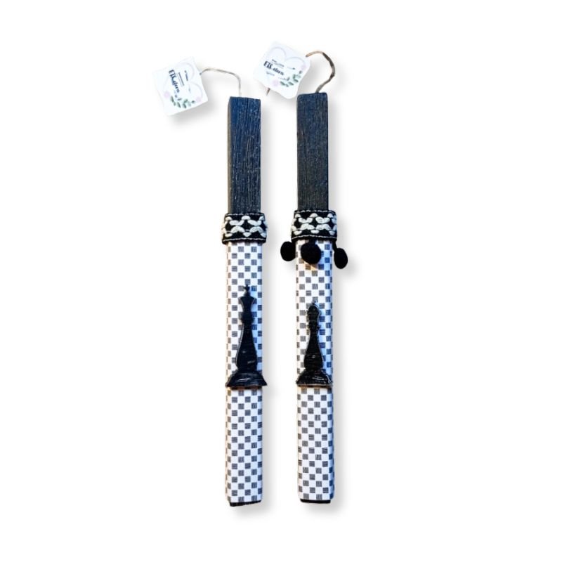 Λαμπάδες για ζευγάρι με ξύλινο στοιχείο βασιλιά και βασίλισσα του σκακιού σε τετράγωνο, ξυστό, αρωματικό, μαύρο κερί 22εκ..