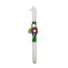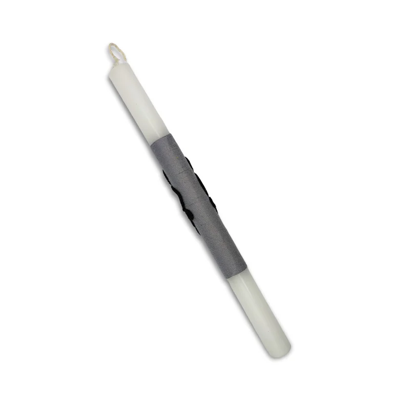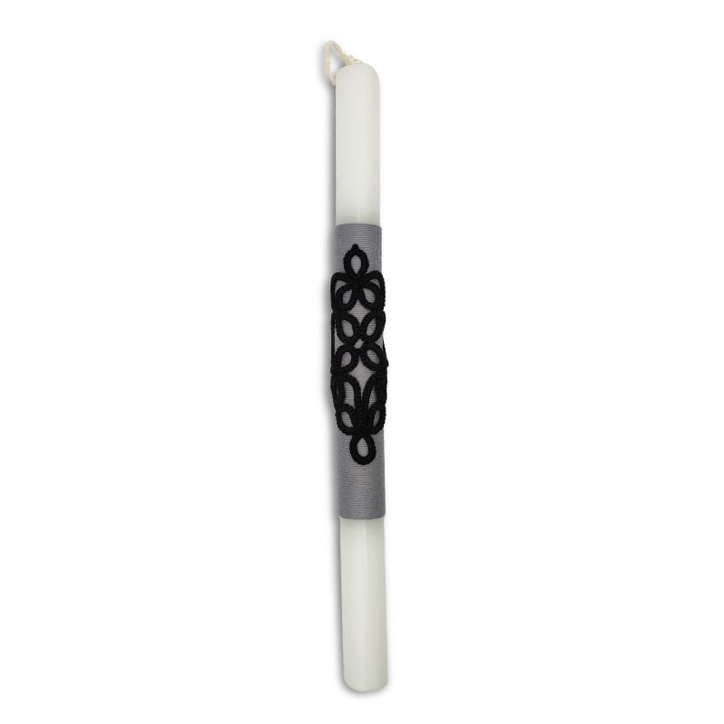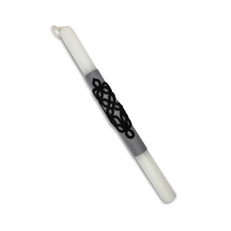 Λευκή κυλινδρική λαμπάδα με μαύρο διακοσμητικό φτιαγμένο με την τεχνική του tatting.