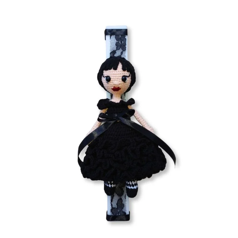 Λευκή με μαύρη δαντέλα στολισμένη με πλεκτή κουκλίτσα Wednesday Addams με το φόρεμα χορού.