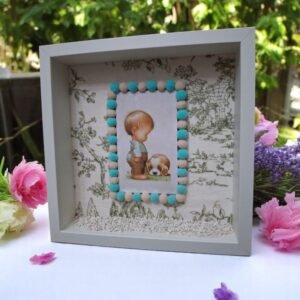 Λευκό κάδρο που έχει παρέα του ένα μικρό αγοράκι και ένα πανέμορφο σκυλάκι. Η διακόσμηση είναι χειροποίητη και τρισδιάστατη αφού υπάρχει χώρος να τοποθετήσουμε μέσα του πολλά στολίδια και διάφορα στοιχεία. Και έτσι να δημιουργήσουν ένα όμορφο αποτέλεσμα.