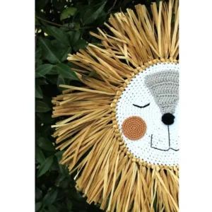 Ένα λιοντάρι για διακοσμητικό δωματίου πλεγμένο με βαμβακερό νήμα και η χαίτη του είναι από ψάθινο νήμα.