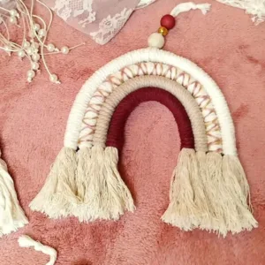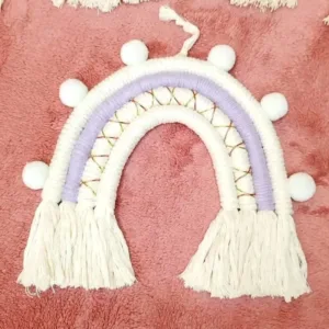 Χειροποίητο ουράνιο τόξο, με πλέξη macrame, φτιαγμένο από 100% βαμβακερό νήμα. Γλυκό και χαρούμενο διακοσμητικό, ιδανικό για παιδικά δωμάτια, καθώς φέρνει ζωντάνια και χρώμα στο χώρο. Μπορεί να προσαρμοστεί στα χρώματα της επιλογής σας κατόπιν παραγγελίας. Διαστάσεις: 17×17 εκατοστά.