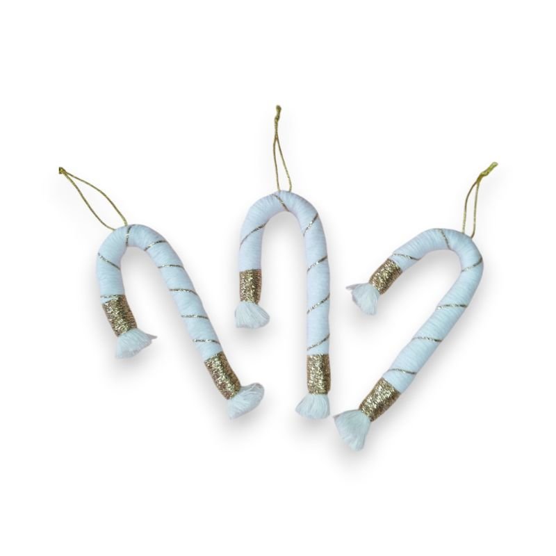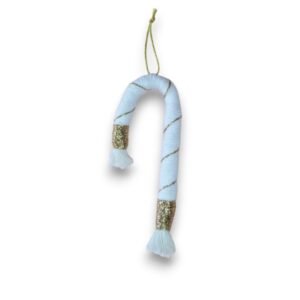 Χειροποίητο macrame στολίδι σε σχήμα ζαχαροκάλαμου. Πρόσθεσε μια γλυκιά πινελιά στο δέντρο σου, με λευκές και χρυσές λεπτομέρειες που θυμίζουν χριστουγεννιάτικα ζαχαρωτά!