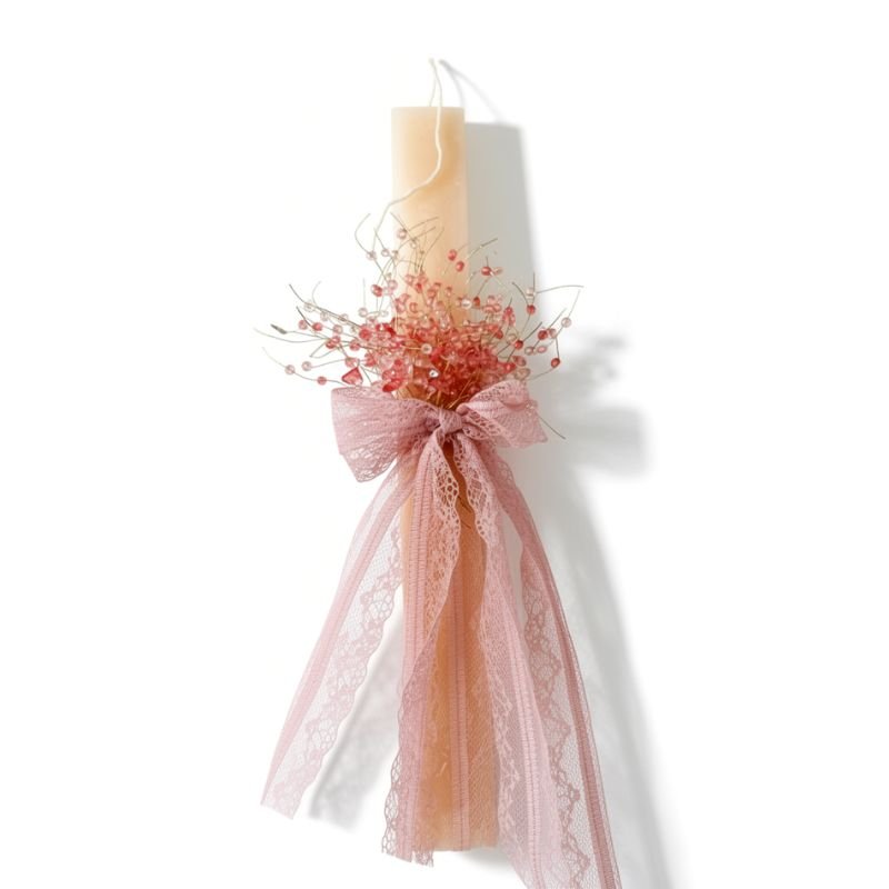 Αυτή η γυναικεία πασχαλινή λαμπάδα ύψους 32 εκ. αποπνέει κομψότητα και ρομαντισμό. Το κεντρικό της στοιχείο είναι ένα όμορφο ροζ δεντράκι, στολισμένο με λαμπερά κρύσταλλα που προσθέτουν μια διακριτική λάμψη.