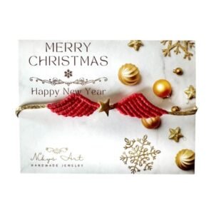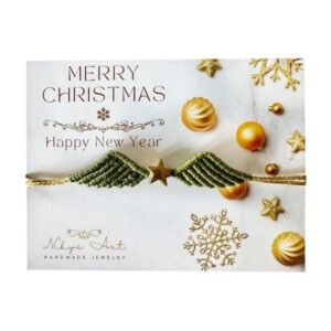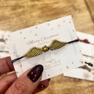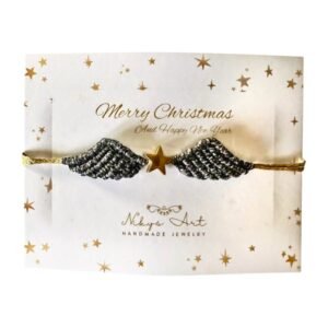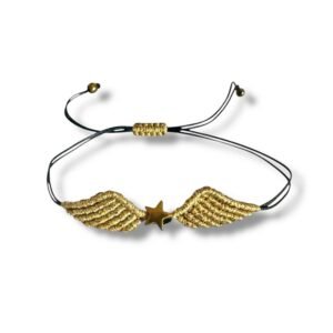 Μακραμέ βραχιόλι ρυθμιζόμενο με χριστουγεννιάτικο σχέδιο Φτερά Αγγέλου, φτιαγμένο με χρυσό μεταλιζέ κερωμένο νήμα και αστέρι από αιματίτη.