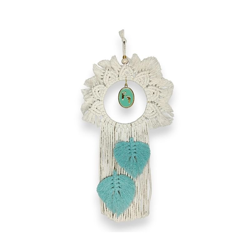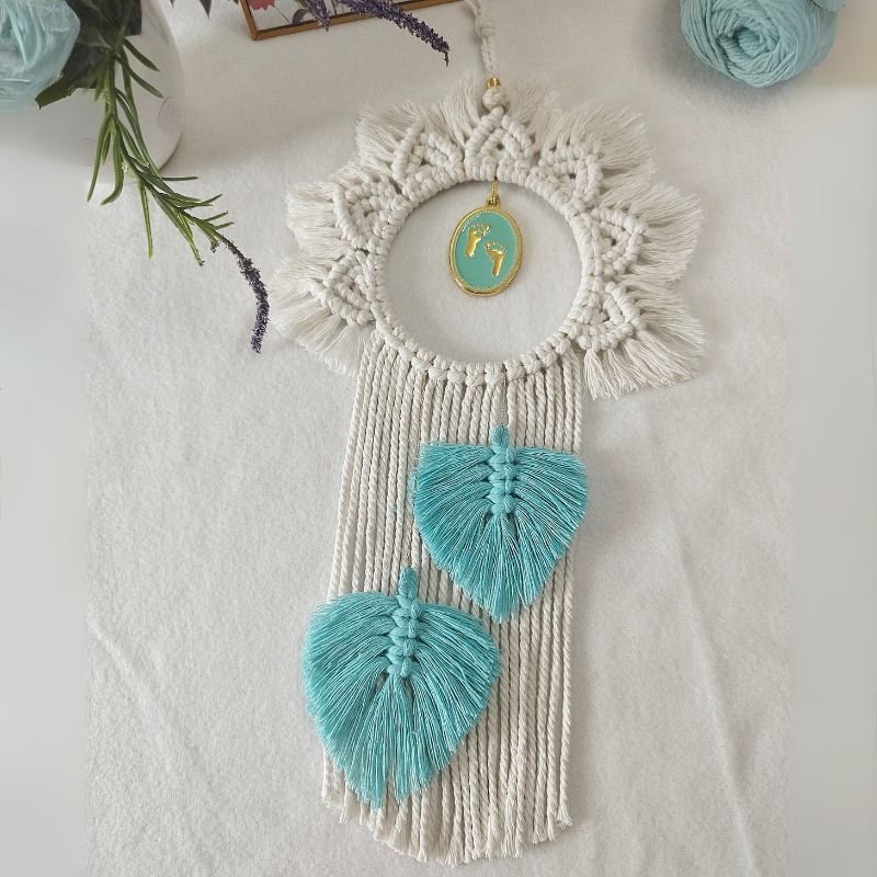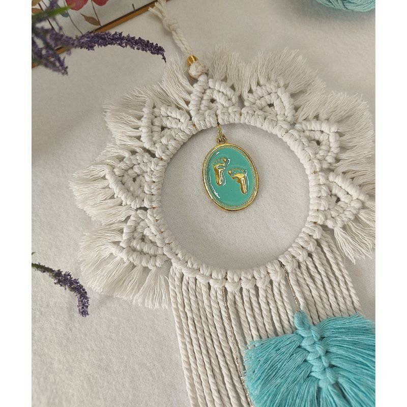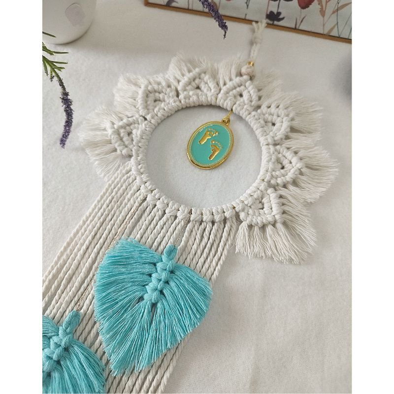 Αυτό το χειροποίητο μακραμέ διακοσμητικό δημιουργήθηκε με πολλή αγάπη, για να στολίσει το παιδικό δωμάτιο! Το βαμβακερό νήμα, σε φυσικό χρώμα, δίνει στο χώρο ζεστασιά και ηρεμία. Τα μικρά πατουσάκια, που βρίσκονται στο κέντρο του πλεγμένου κρίκου, καθιστούν το διακοσμητικό ιδανικό ως δώρο για νεογέννητο ή βρέφος.