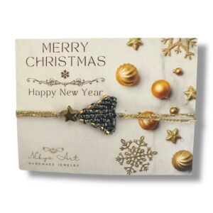 Μακραμέ βραχιόλι ρυθμιζόμενο με σχέδιο χριστουγεννιάτικο δέντρο, φτιαγμένο με μαύρο-ασημί μεταλιζέ κερωμένο νήμα και αστέρι από αιματίτη.