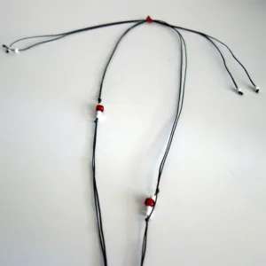 Στρογγυλό μακρύ μενταγιόν από τσιμέντο, ζωγραφισμένο στο χέρι και περασμένο με ακρυλικό οικολογικό βερνίκι. Στο δέσιμο έχει χρησιμοποιηθεί κηροκλωστή , κόκκινες και λευκές χάντρες καθώς και ένα κόκκινο τριανταφυλλάκι απο πάστα κοραλλιού.