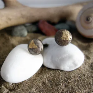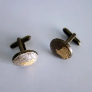 Μανικετόκουμπα από χρωματιστό τσιμέντο με ένα κομματάκι από φύλλο χρυσού αγιογραφίας, περασμένα με ακρυλικό οικολογικό βερνίκι. Πάνω σε μεταλλική βάση σε χρώμα χρυσό αντικέ.