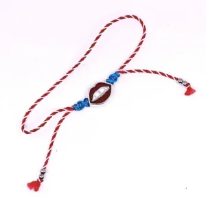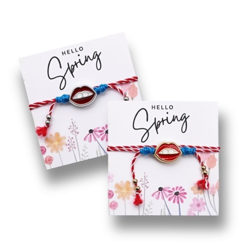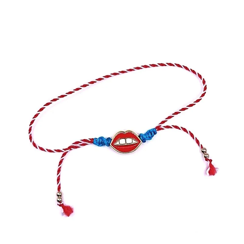 Μαρτάκι μεταλλικά κατακόκκινα Χείλη σε δίχρωμο κορδόνι λευκό-κόκκινο και έντονο τυρκουάζ δέσιμο στριφτό στο πάνω μέρος του καρπού. Ρυθμιζόμενο μήκος.