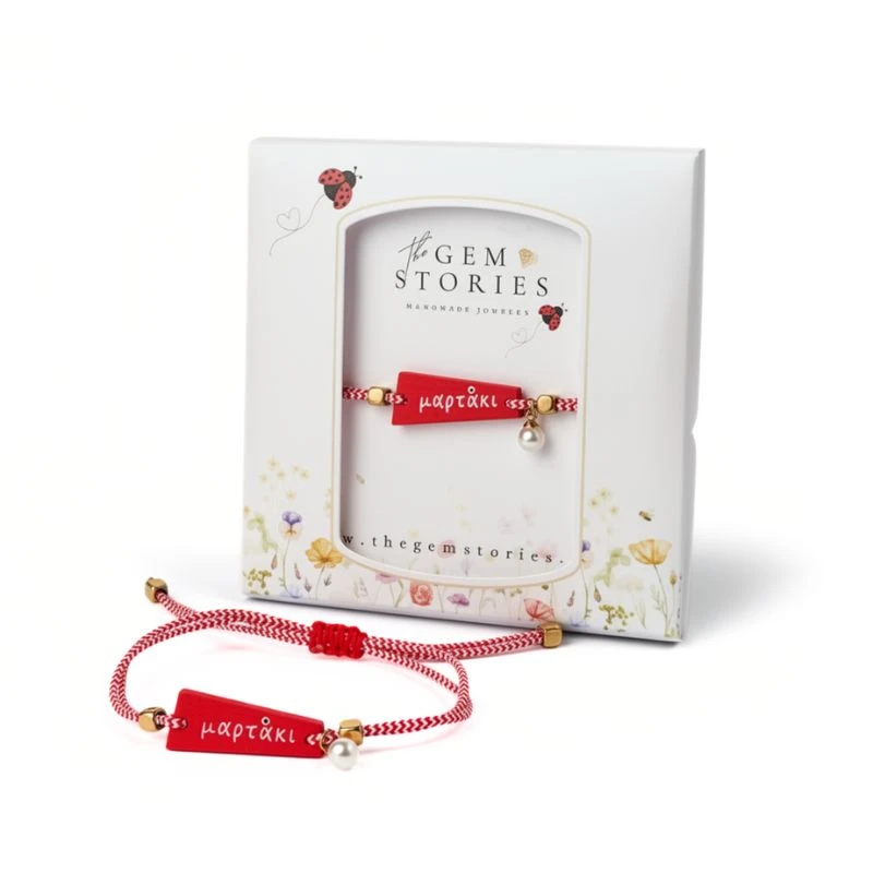 Χειροποίητο μαρτάκι μακραμέ με διακριτικό στοιχείο πέρλας που συμβολίζει καθαρότητα και κομψότητα.