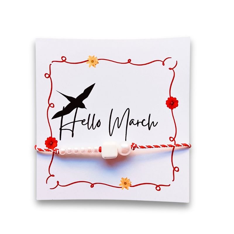 Γυναικείο βραχιόλι μαρτάκι με άσπρο και κόκκινο κορδόνι, ένα κομψό και διαχρονικό κόσμημα που συνδυάζει την παράδοση με τη σύγχρονη αισθητική.
